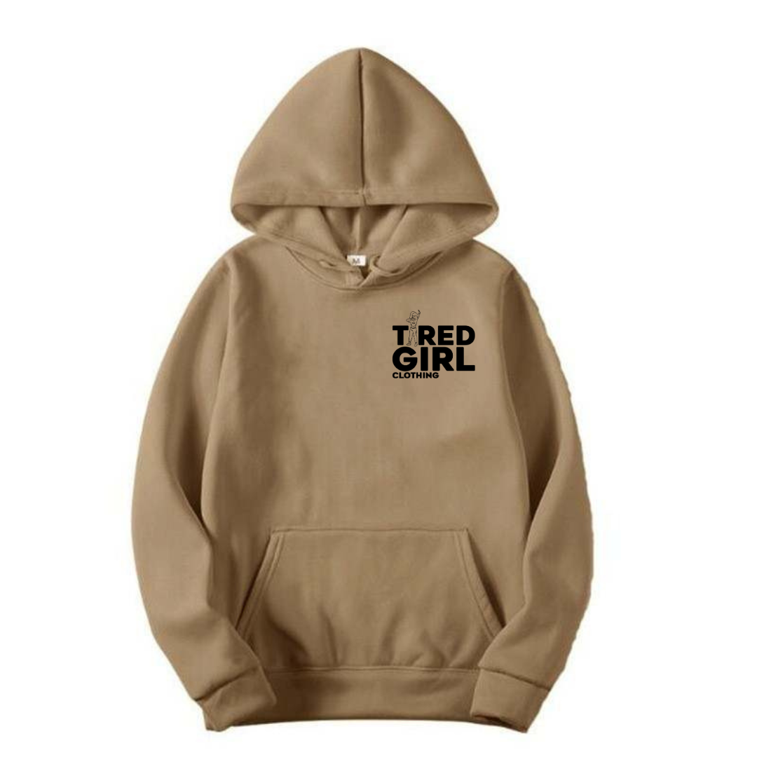 Sahara brown hoodie with fleece lining, front pocket, drawstrings, and small black logo on upper left chest.